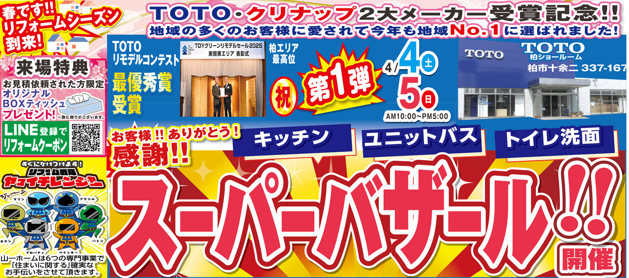 EVENT お知らせ 【第2弾 クリナップ柏 スーパーバザール イベント開催報告】 開催場所:4/18(土)・19(日) クリナップ柏ショールーム 初夏をおもわせる暑さの中、大変たくさんのお客様にご来場いただき、誠にありがとうございました。 無事に終わることができ、皆様に感謝申し上げます。 まだまだご相談OK 第1弾・第2弾とも、ご都合がつかなかったお客様、安心してくだい。 まだまだ、このスーパーバザール開催中です。 御見積は無料です。チラシに載せ切れなかった商品もございます。 ぜひ、ご連絡ください。 スタッフ一同心よりお待ちしております。