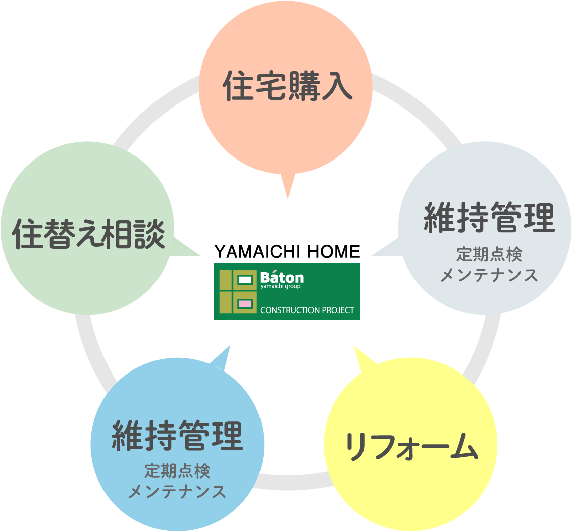 | リフォーム | 住まいのお手入れが必要になった場合、見守り続けている山一ホームグループだからこそのきめ細かいご提案をし、資産価値を高めて参ります。 |