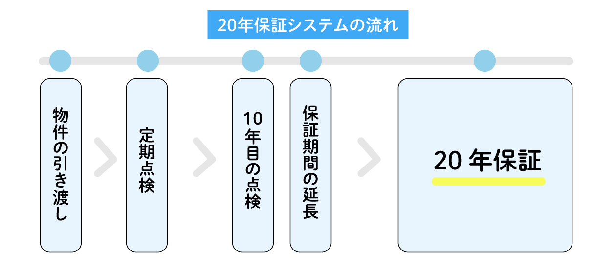 バトンでは、法律上の瑕疵担保責任の10年保証に、10年目の有償メンテナンス工事を行う事でさらに10年延長して保証するシステムをご用意。(メンテナンス工事の有無を判断するための点検は無料です。)建物引渡し後10年が経過した時点で、構造上主要な部分にそこまで問題が発生していなければ、その後問題は発生しません。しかし、雨水の浸入関係は10年目まで問題がなくても今後、経年変化により防水やコーキングが切れ雨漏りの危険が考えられますので、しっかりとした点検が必要です。